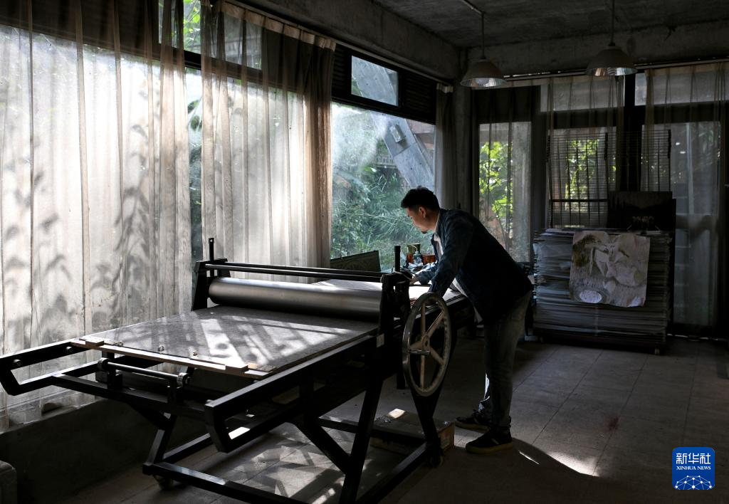 12月9日,在云南普洱学院那柯里绝版木刻教学实践基地,基地负责人、绝版木刻画家冷光冕在印制版画。