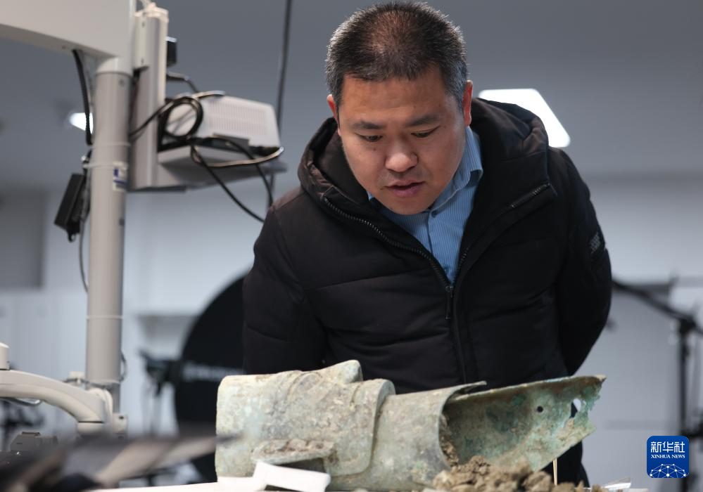 12月16日,在三星堆研究院,考古专家在查看青铜器金属含量样本。