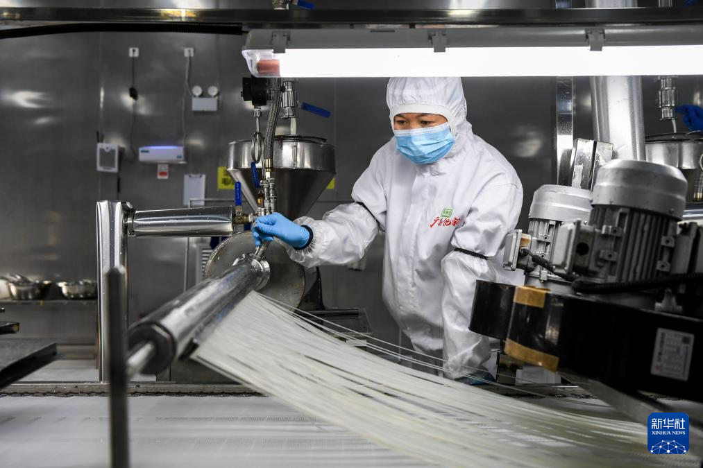 12月13日,在柳州市一家螺蛳粉生产企业,工作人员在查看米粉的生产情况。