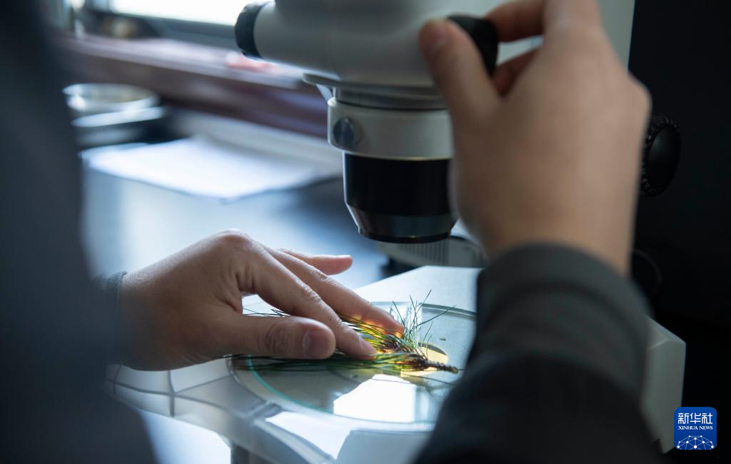 12月18日,黄山风景区管委会园林局高级工程师吴贻军在检验检疫室里观察松针样本。
