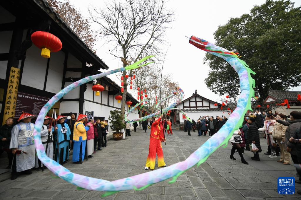 1月7日,人们在阆中古城观看舞龙舞狮。