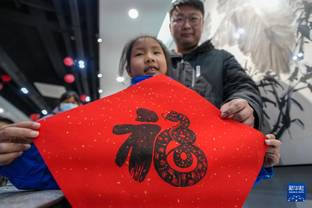 1月11日,小朋友在活动中体验非遗项目雕版印刷。