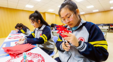 1月13日,剪纸艺人在河北省石家庄市天苑小学教孩子们剪窗花。