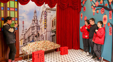 1月13日,在山东省高密市金苹果幼儿园新春游园活动现场,孩子们在晒福字。