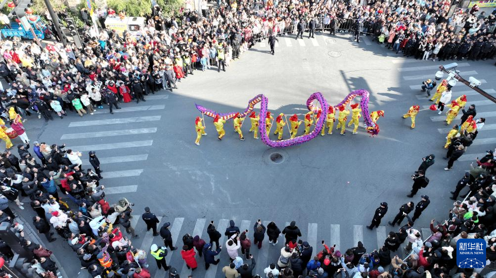 2月9日,舞龙队在浙江省湖州市德清县乾元镇巡游展演(无人机照片)。