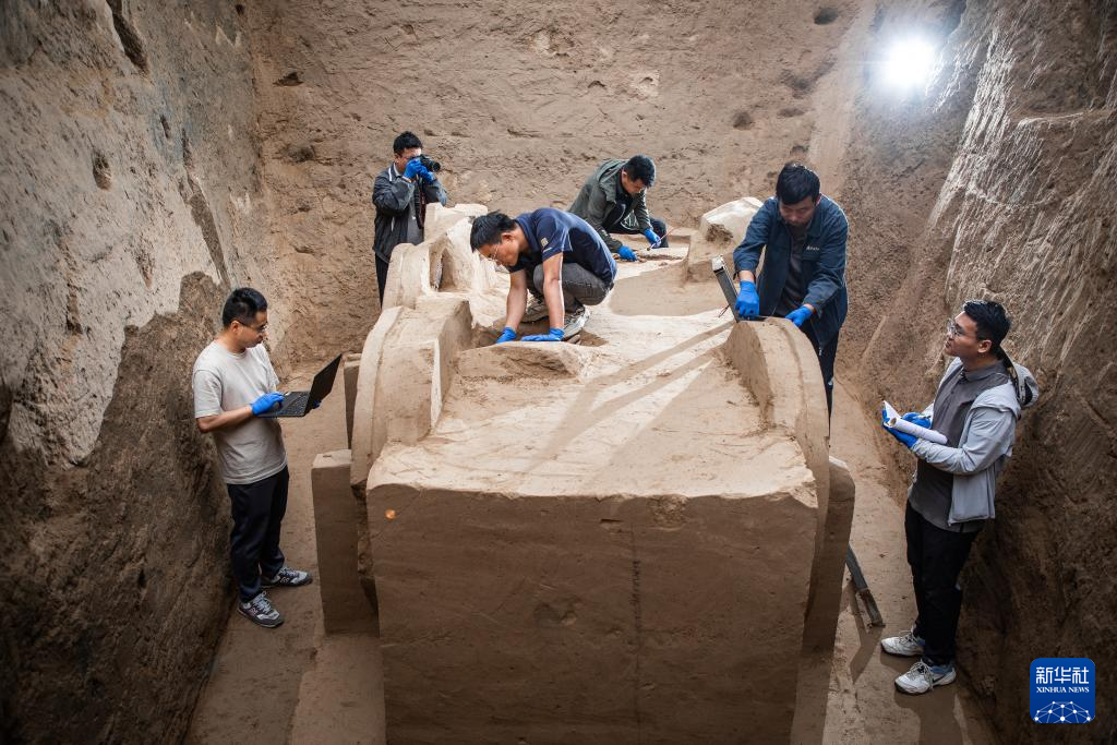 陕西省考古研究院寨沟遗址考古队在陕西清涧瓦窑沟墓地M4号墓葬清理马车(2025年9月11日摄)。