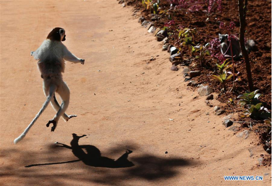 A lemur jumps like a ballet dancer in a conservation area in Madagascar, Aug. 5, 2017. (Xinhua/Xu Congjun)