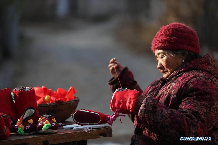 Zhao Kaiying makes tiger-head shoes in Tancheng County of Linyi, east China's Shandong Province, Dec. 24, 2017. Zhao Kaiying, 85-year-old, has been making tiger-head shoes for more than 20 years. Tiger-head shoes, with their bright colors and intricate patterns, is a traditional wearing for children in China symbolizing good wishes. (Xinhua/Zhang Chunlei)Zhao Kaiying makes tiger-head shoes in Tancheng County of Linyi, east China's Shandong Province, Dec. 24, 2017. Zhao Kaiying, 85-year-old, has been making tiger-head shoes for more than 20 years. Tiger-head shoes, with their bright colors and intricate patterns, is a traditional wearing for children in China symbolizing good wishes. (Xinhua/Zhang Chunlei)