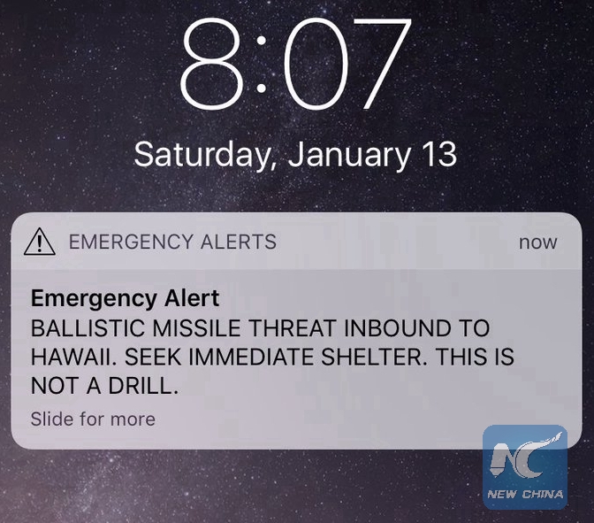 A screen capture from the Twitter account of U.S. Congresswoman Tulsi Gabbard shows a missile warning for Hawaii, the United States. on January 13, 2018. (Xinhua)