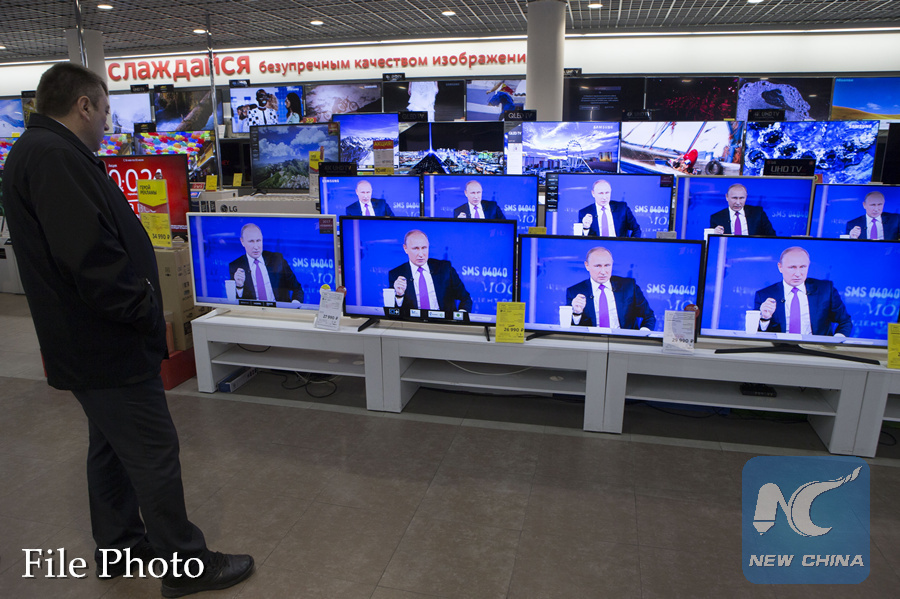 A customer watches TV as Russian President Vladimir Putin speaks during a televised event at a shop in Moscow, Russia, on June 15, 2017. (Xinhua/Oleg Brusnikin)