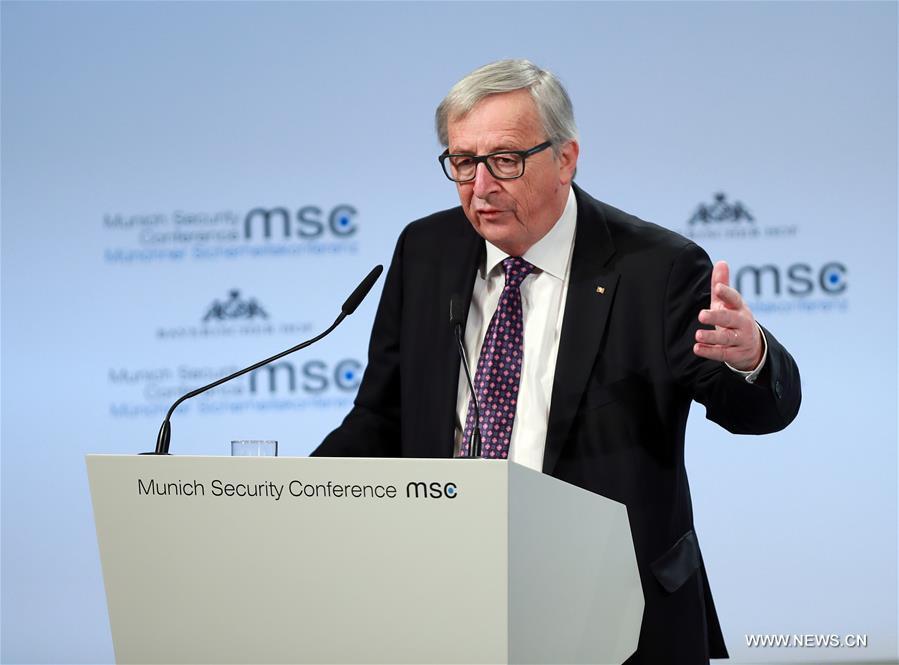 European Commission President Jean-Claude Juncker speaks during the 54th Munich Security Conference (MSC) in Munich, Germany, on Feb. 17, 2018. Juncker here on Saturday urged to simplify processes of decision-making in the European Union (EU) defense and security policy. (Xinhua/Luo Huanhuan)