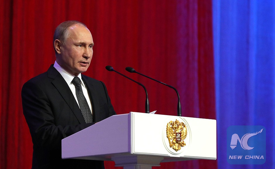 MOSCOW, Feb. 22 (Xinhua) -- Russian President Vladimir Putin said here Thursday that Russia's combat efficiency and quality of weapons can be ranked the best in the world, which ensures the country's safety.