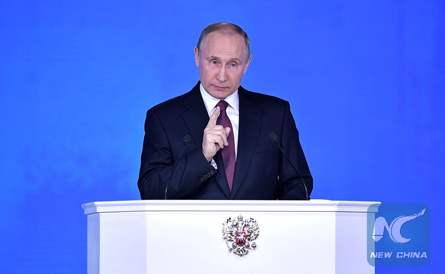 MOSCOW, March 1 (Xinhua) -- Russian President Vladimir Putin demonstrated his power as a strong leader in his annual address to the parliament on Thursday, two weeks before the presidential election when he will seek a fourth term.