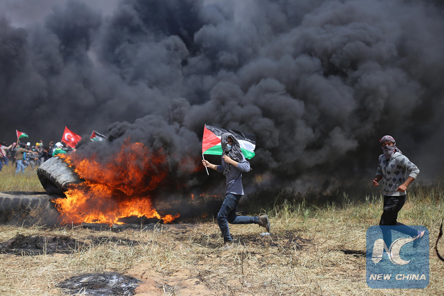A Xinhua cameraman said he saw large black smoke after tires were burned in the borderline area. The demonstrators wanted to disturb Israeli army snipers from targeting the demonstrators, he added.
