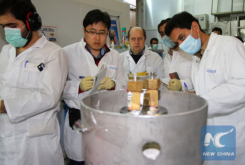 (File Photo) In this file photo taken on January 20, 2014, unidentified International Atomic Energy Agency (IAEA) inspectors (2nd-3rd L) and Iranian technicians disconnect the connections between the twin cascades for 20 percent uranium production at nuclear power plant of Natanz, Iran. (AFP)