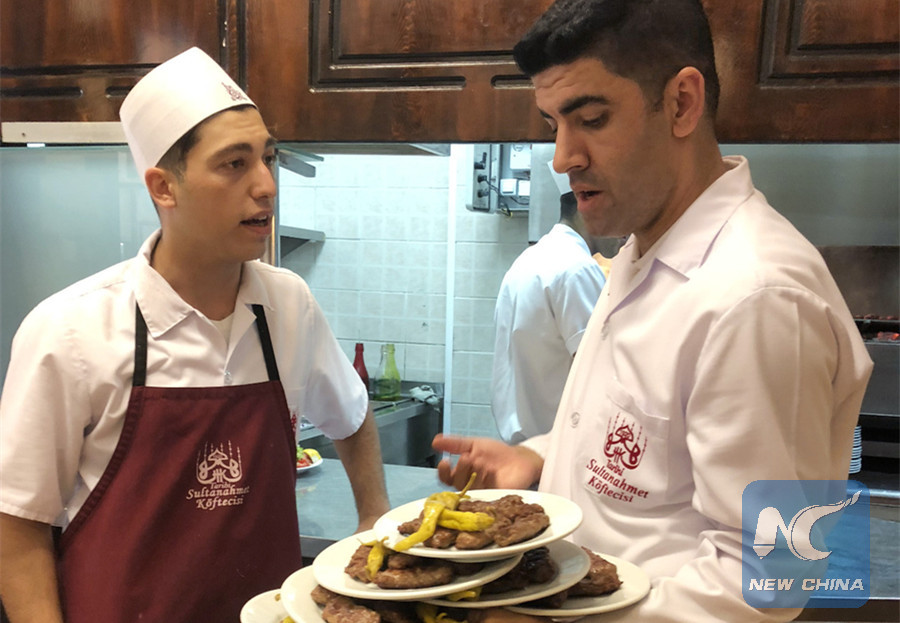 Two chefs discuss while holding plates of meatballs in the open kitchen of the restaurant Sultanahmet Koftecisi at Sultanahmet Square in Istanbul, Turkey, on July 31, 2018. (Xinhua/ He Canling)