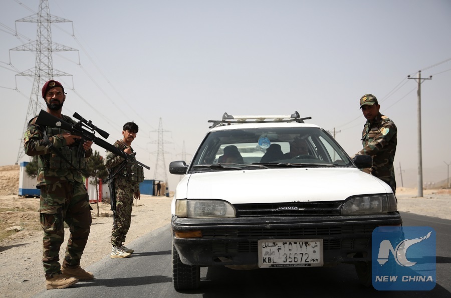 Afghan security force members check a vehicle at a security checkpoint on Kabul-Ghaznihighway in Wardak province, Afghanistan, Aug. 13, 2018. (Xinhua/Rahmat Alizadah)