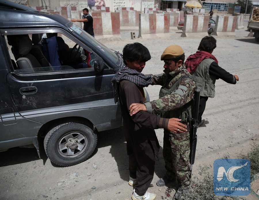 An Afghan security force member checks a passenger at the entrance gate of Kabul, capital of Afghanistan, Aug. 13, 2018. (Xinhua/Rahmat Alizadah)
