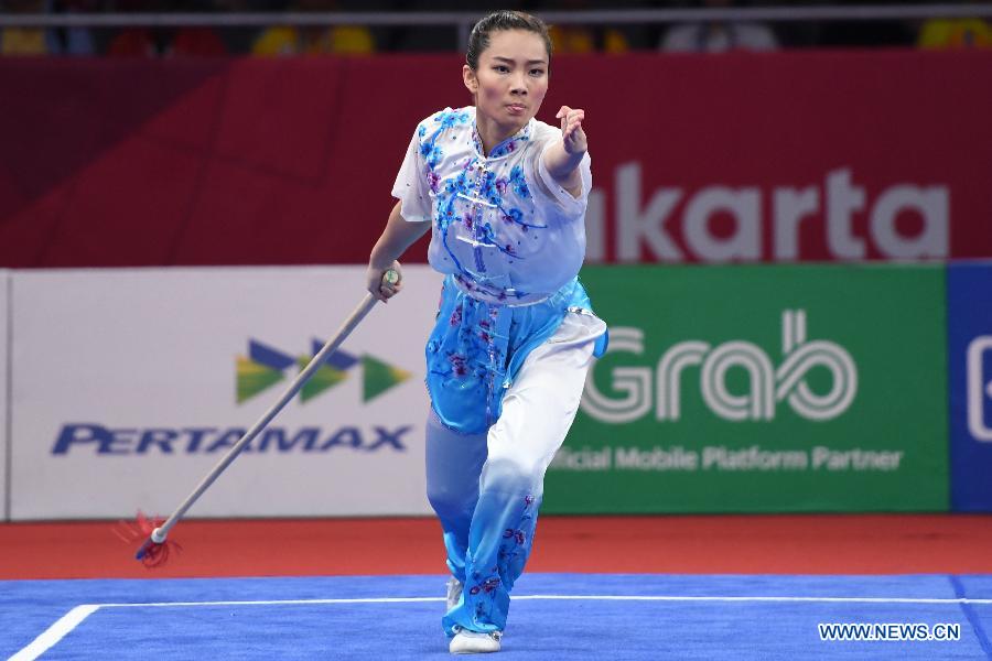 Sham Hui Yu Lydia of China's Hong Kong competes during the Qiangshu competition of Women's Jianshu & Qiangshu All-Round match at the 18th Asian Games in Jakarta, Indonesia, Aug. 21, 2018. (Xinhua/Cheong Kam Ka)