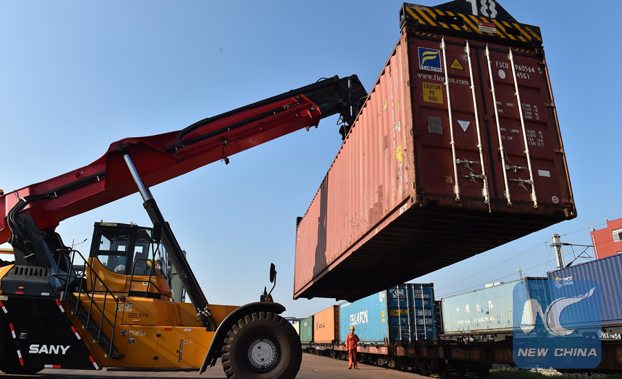 A container is loaded onto the freight train from Rizhao to Central Asia at a container station of Rizhao port in east China's Shandong Province, Sept. 12, 2017. (Xinhua/Guo Xulei)