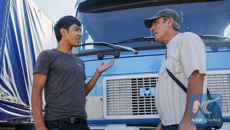 A driver from Kazakhstan (R) communicates with a Chinese translator in Horgos, northwest China's Xinjiang Uygur Autonomous Region, Aug. 4, 2018. (Xinhua/Huang Zhen)
