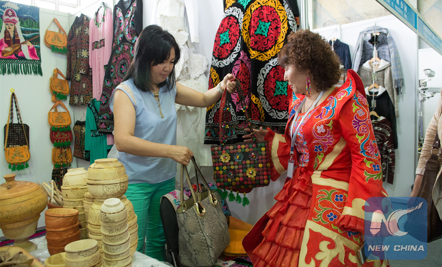 An exhibitor shows folk costumes at the 6th Chinese Xinjiang Export Commodities Fair in Bishkek, capital city of Kyrgyzstan, June 1, 2016. (Xinhua/Roman Gainanov)