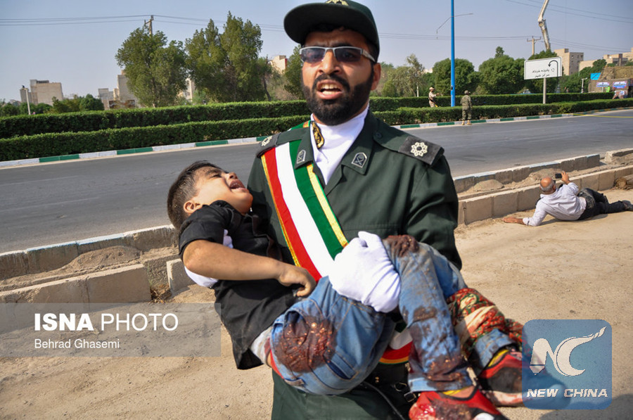 A Iranian serviceman holds an injured child in an attack on a military parade in Ahvaz, Iran, on Sept. 22, 2018. This photo is watermarked from source. (ISNA photo)