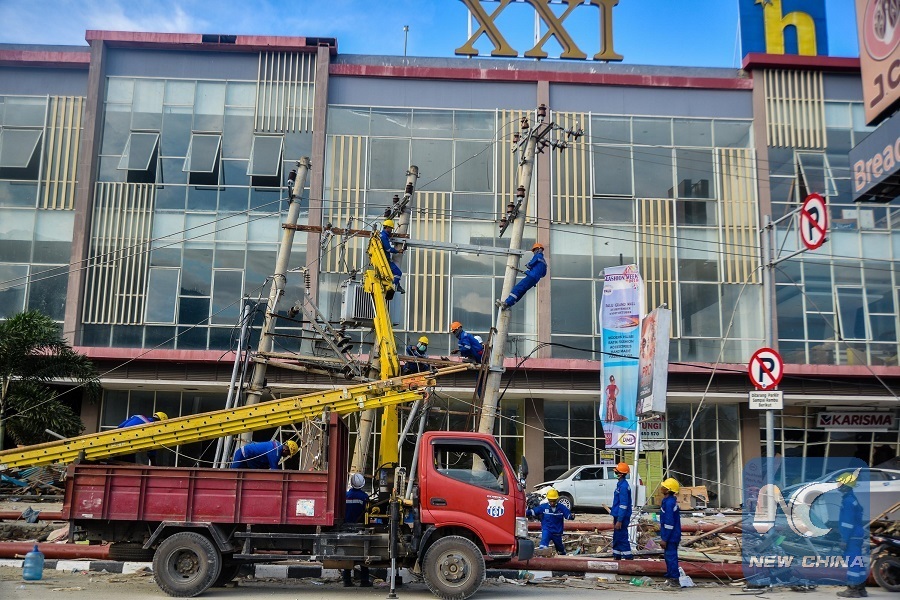 Workers maintain electric wires after the earthquake and tsunami in Palu, Indonesia, on Oct. 6, 2018. (Xinhua/Iqbal Lubis)