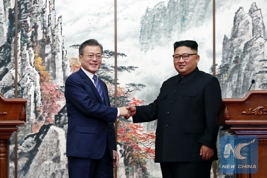 The photo shows Kim Jong Un (R), top leader of the Democratic People's Republic of Korea (DPRK), shakes hands with South Korean President Moon Jae-in after a joint press conference in Pyongyang, the DPRK, on Sept. 19, 2018. (Xinhua/Pyongyang Press Corps)