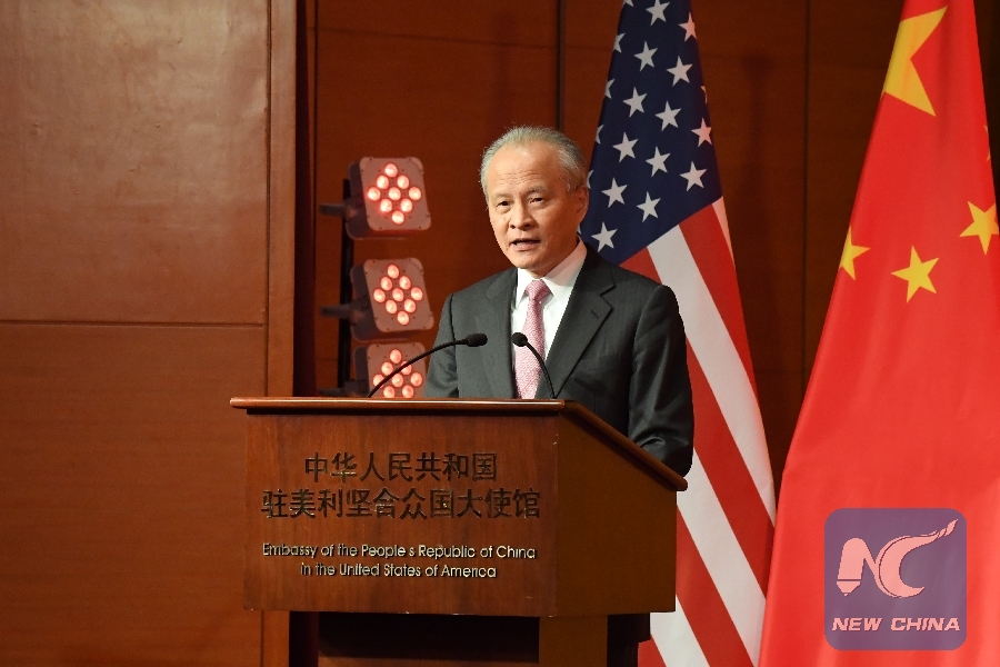 File Photo: Chinese Ambassador to the United States Cui Tiankai speaks at the Embassy of the People's Republic of China in the United States of America during a Chinese New Year celebration reception in Washington D.C., the United States, on Feb. 13, 2018. (Xinhua/Yang Chenglin)