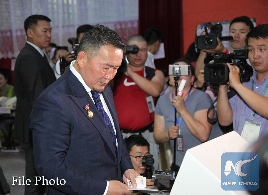 Battulga Khaltmaa (L), presidential candidate of the opposition Democratic Party, casts his ballot in a polling station in Ulan Bator, Mongolia, June 26, 2017. (Xinhua/Asigang)