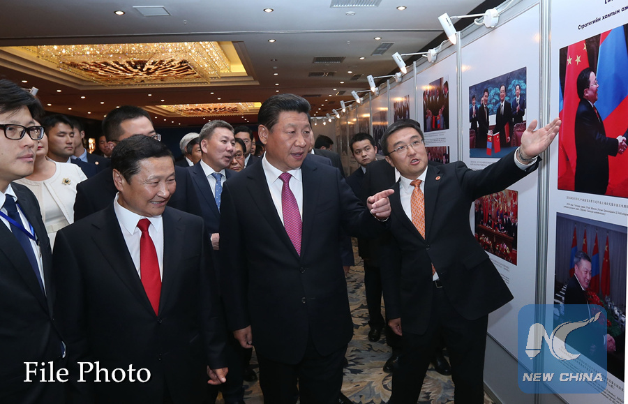 Chinese President Xi Jinping (C) attends the opening ceremony of an exhibition about the past economic and trade cooperation between China and Mongolia in Ulan Bator, Mongolia, Aug. 22, 2014. (Xinhua/Pang Xinglei)