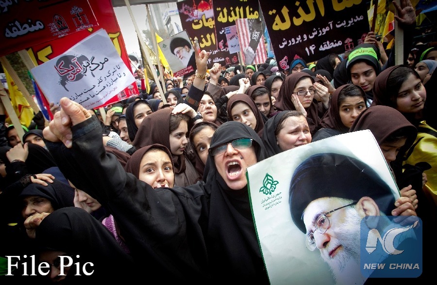 Iranian demonstrators shout slogans during a rally marking the 34th anniversary of the seizure of the U.S. Embassy outside the former U.S. embassy in downtown Tehran, capital of Iran, on Nov. 4, 2013. (Xinhua File photo)