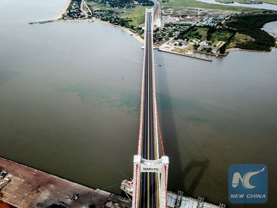 Aerial photo taken on April 8, 2019 shows the Maputo Bay Bridge in Maputo, Mozambique. The longest twin-tower suspension bridge in Africa, which hovers across the Maputo Bay with a main span of 680 meters, was officially open to traffic in November of 2018. The bridge is part of the Maputo Bridge and Link Roads project built by the China Road and Bridge Corporation, with Chinese standards and financing support. (Xinhua/Zhang Yu)