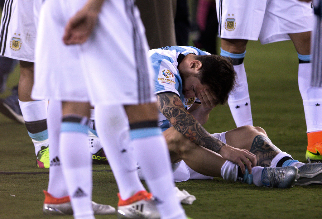 Argentina's Lionel Messi (R) sits on the ground in dejection after losing the final of 2016 Copa America Centenario soccer tournament at the Metlife Stadium in New Jersey, the United States on June 26, 2016. Chile defeated Argentina with 4-2 in penalty shootout. (Xinhua/Li Muzi)