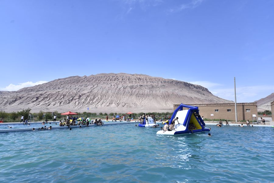Since the beginning of this summer, the daily maximum temperature in Turpan has mostly been above 35 degrees Celsius, helping the swimming pool attract more than 200 visitors every day.
