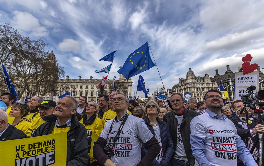 Demonstrators protest during the "Put it to the People" march in central London, Britain, on March 23, 2019.(Xinhua/Han Yan)