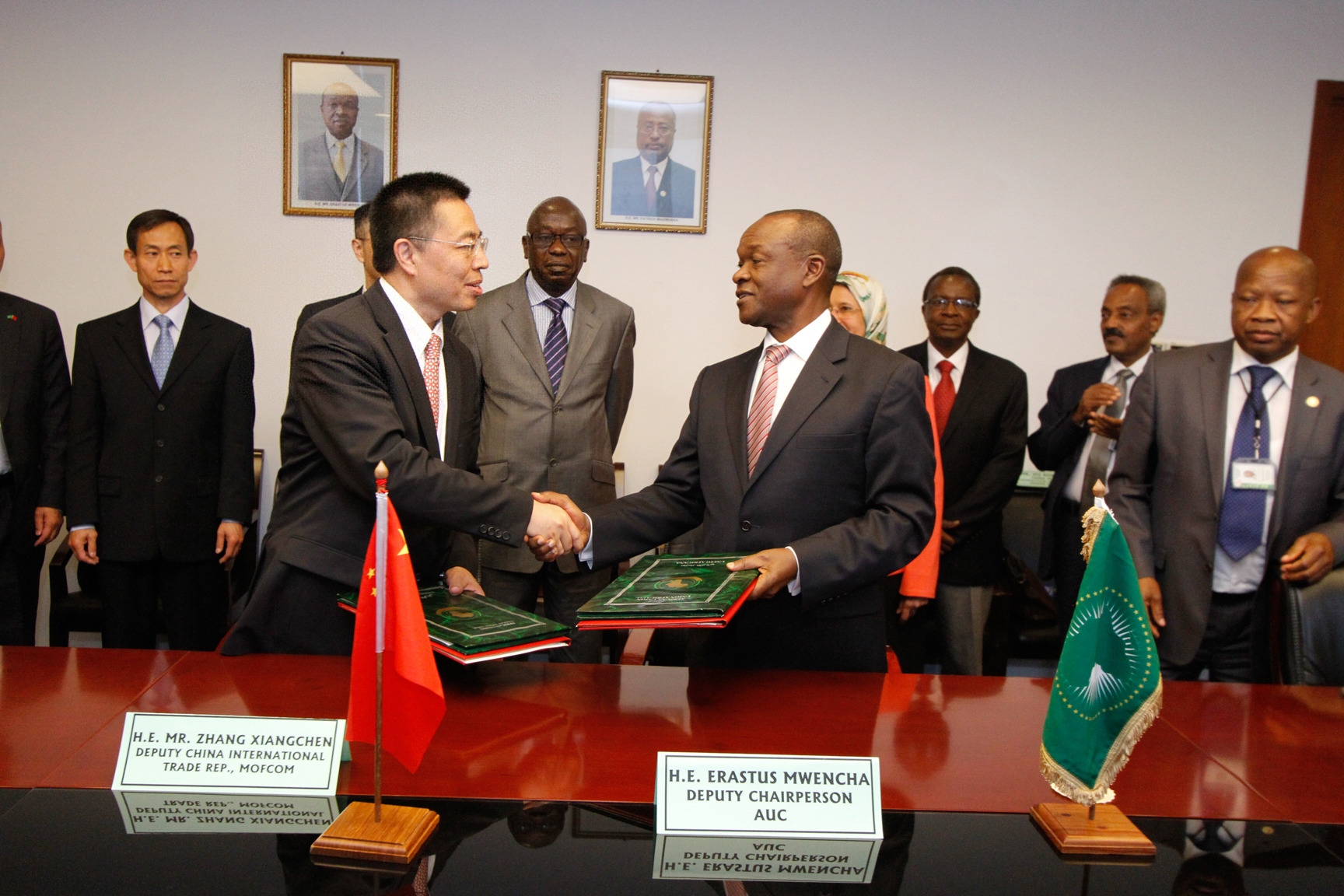 Zhang Xiangchen (L Front), Deputy International Trade Representative from the Chinese Ministry of Commerce exchanges signed Memorandum Of Understanding (MOU) documents on Cooperation for Africa Centers for Disease Control and Prevention (Africa CDC) with Erastus Mwencha (R Front ), Deputy Chairperson of the African Union Commission (AUC) at the African Union (AU) headquarters in Addis Ababa, capital of Ethiopia, June 16, 2016. (Xinhua/Michael Tewelde)