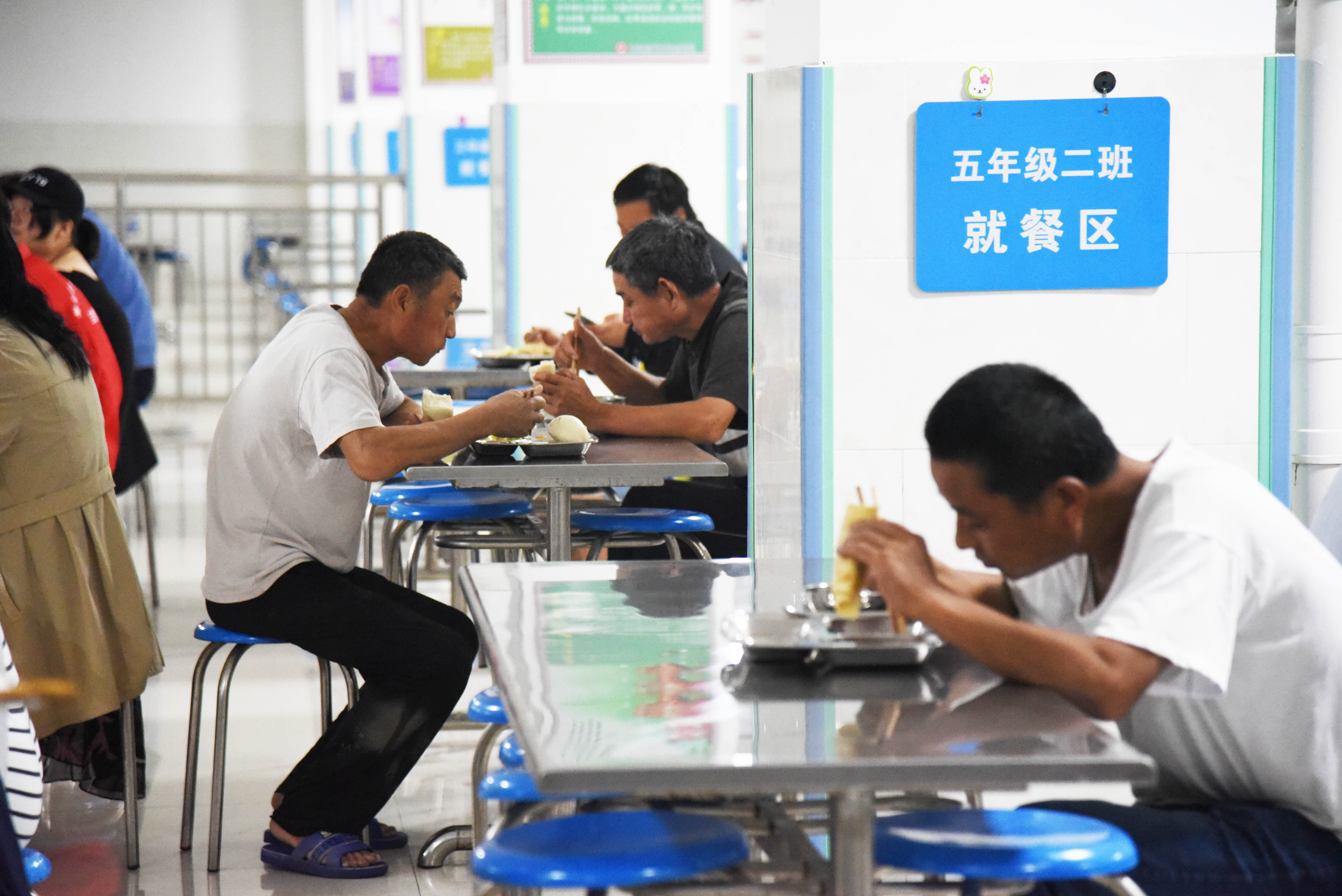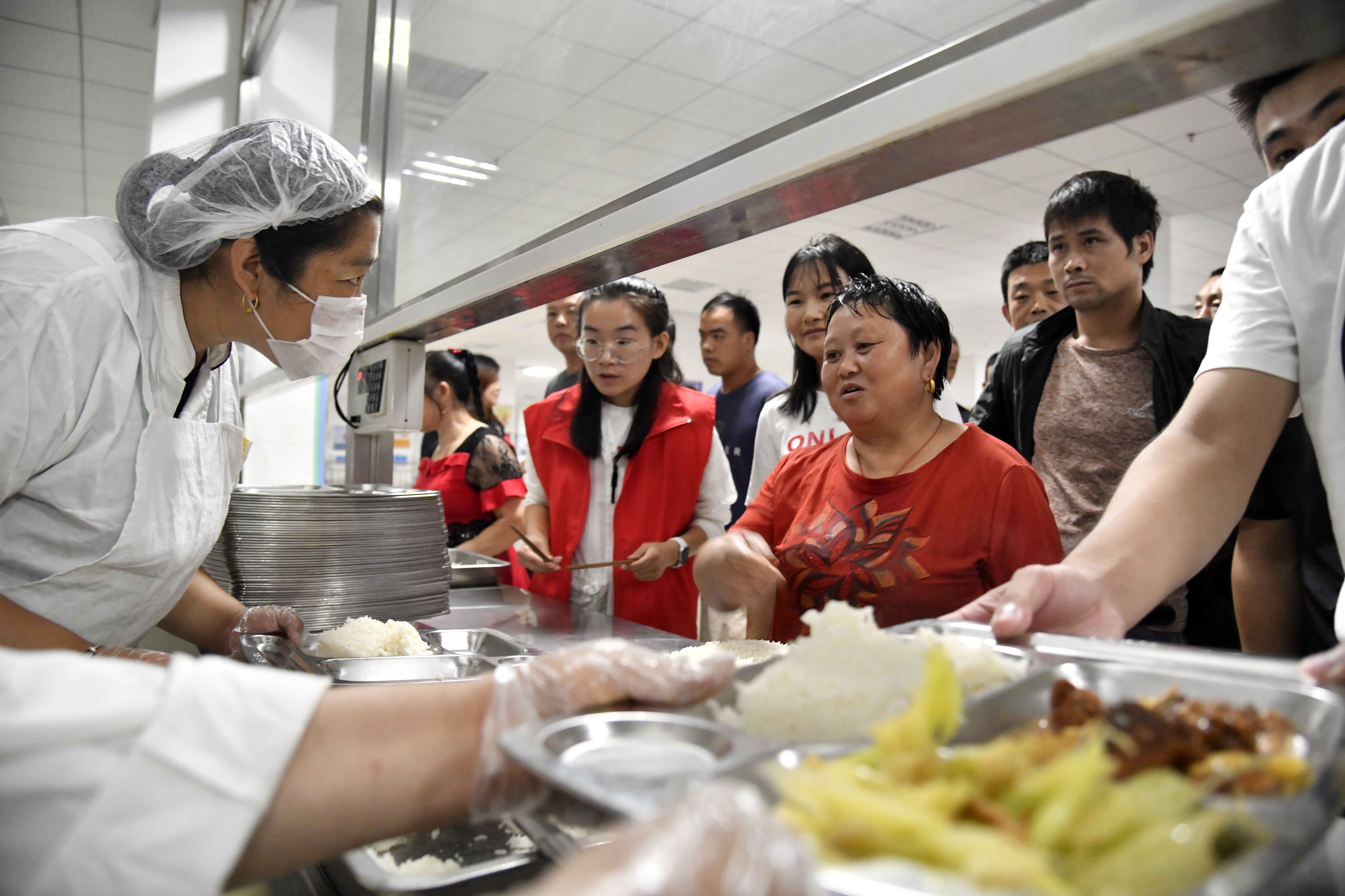 People get meals at a middle school, which now serves as a relocation site, in Shouguang, E China's Shandong Province. (Xinhua/Guo Xulei)