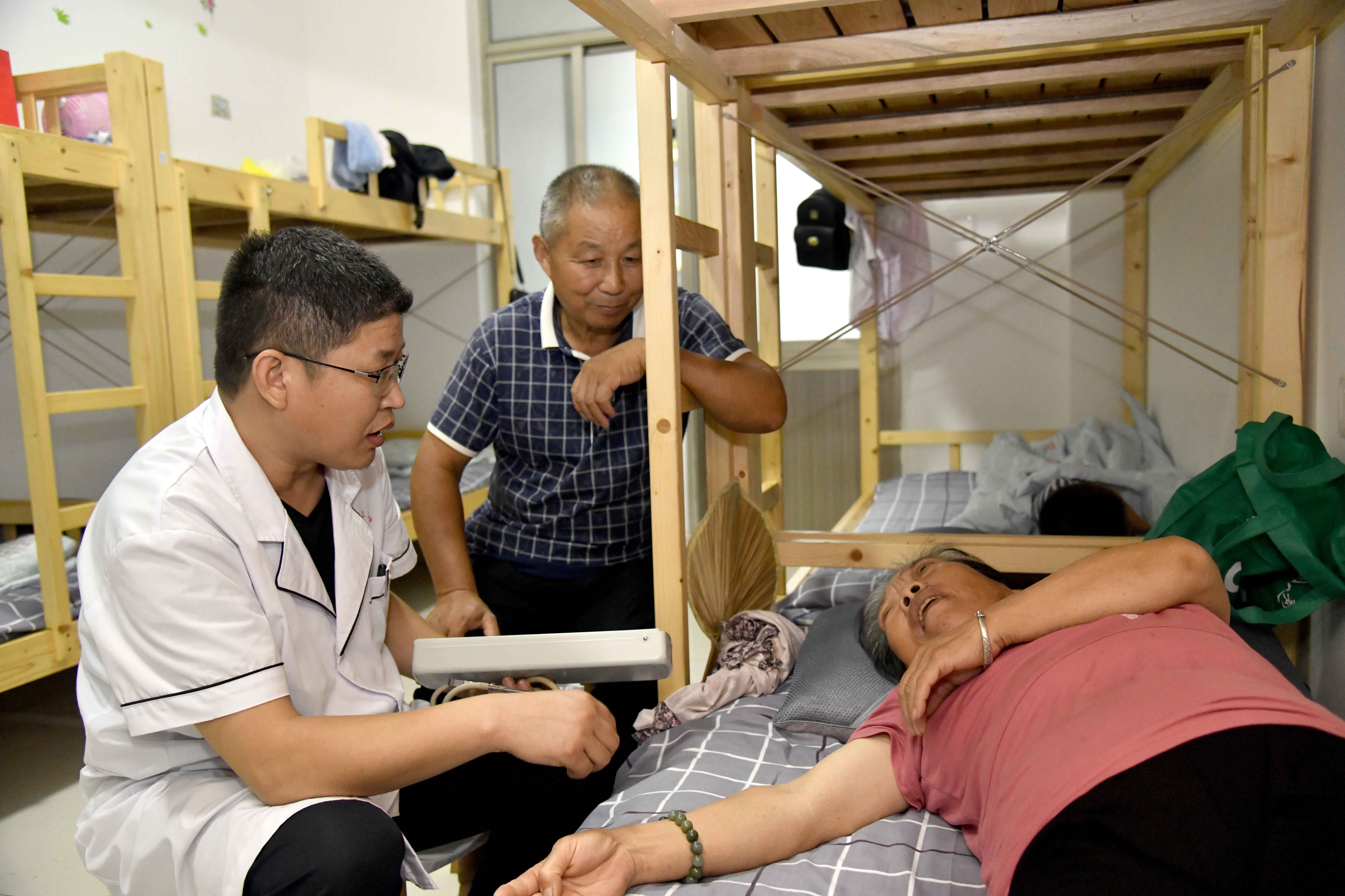 A resident receives medical treatment at a middle school, which now serves as a relocation site, in Shouguang, E China's Shandong Province. (Xinhua/Guo Xulei)