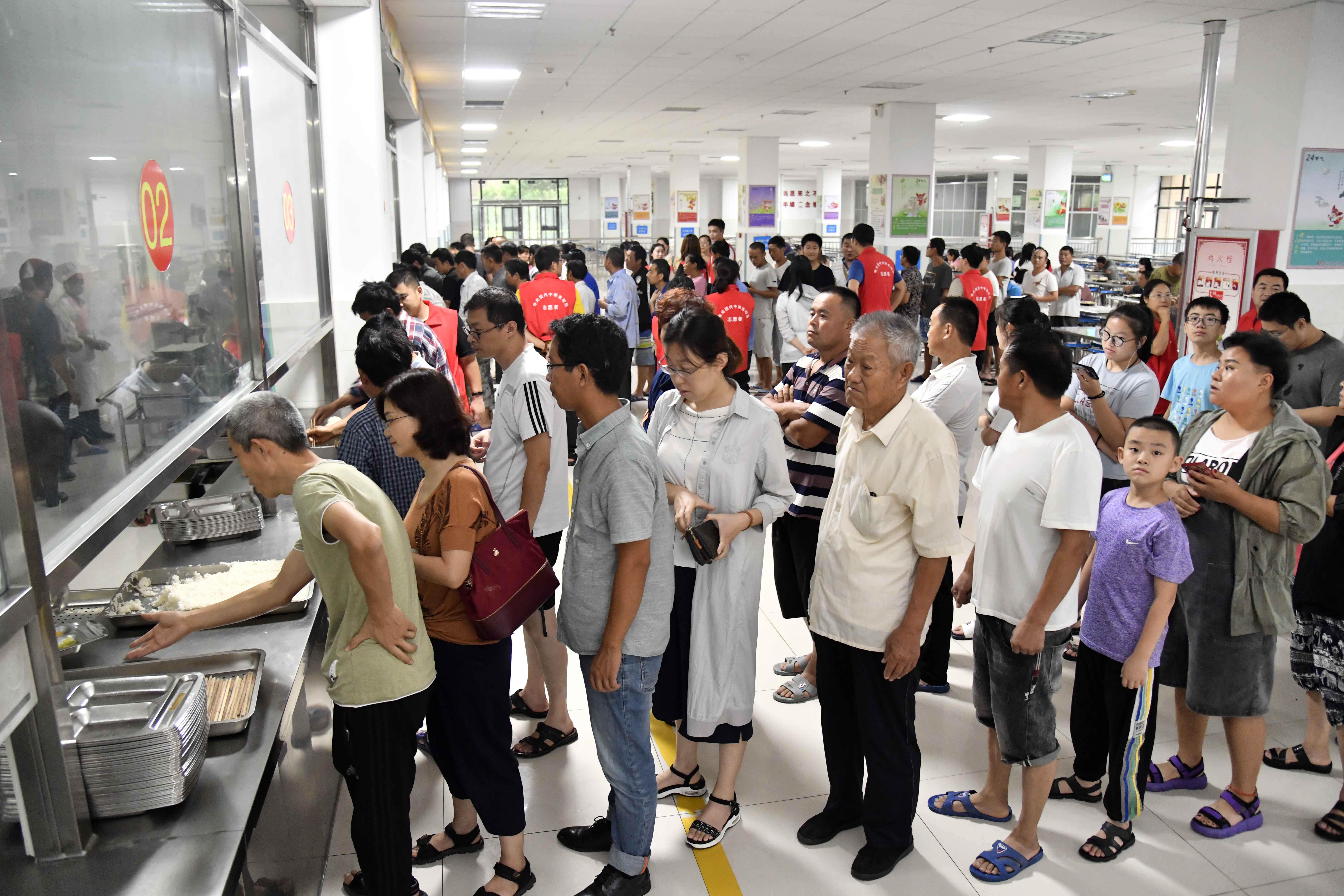 People line up to get meals at a middle school, which now serves as a relocation site, in Shouguang, E China's Shandong Province. (Xinhua/Guo Xulei)
