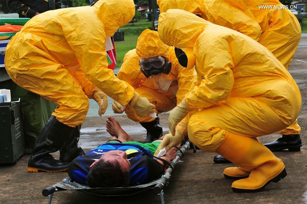 Participants take part in the comprehensive epidemic prevention and control drills during the "Peace Train-2019" China-Laos humanitarian and medical joint rescue exercise in Vientiane, capital of Laos, Aug. 18, 2019. (Xinhua/Zhang Jianhua)