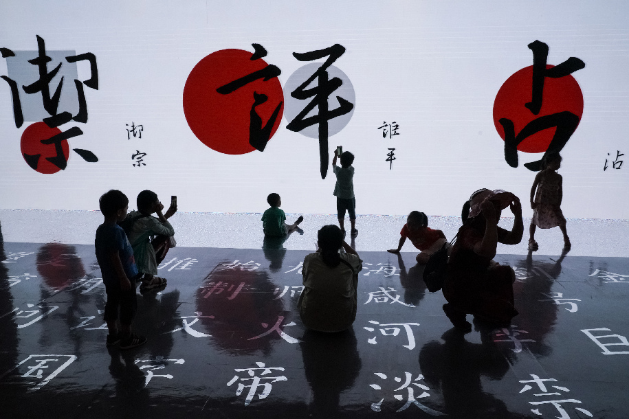 Visitors take photos as Chinese characters are shown on an electronic screen in an exhibition on Chinese characters in National Museum of China in Beijing, capital of China, Aug. 24, 2019. (Xinhua/Shen Bohan)