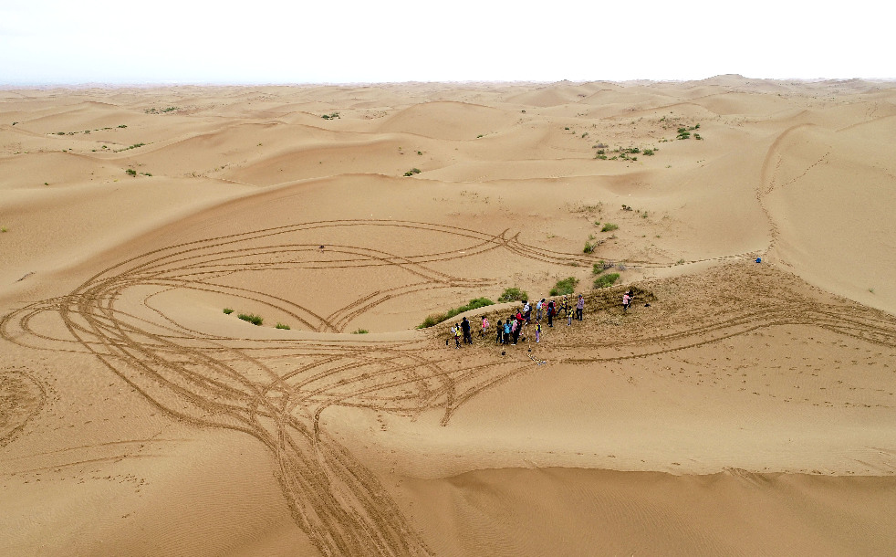 Aerial photo taken on Aug. 23, 2019 shows a group of students with their parents from Beijing taking part in a summer vacation activity featuring desertification control at the Shapotou desert-themed scenic spot in Zhongwei City, northwest China's Ningxia Hui Autonomous Region. (Xinhua/Feng Kaihua)