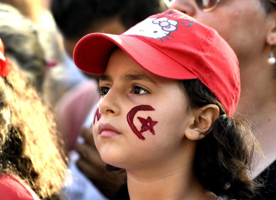 A Tunisian girl watches the African Cup semifinal match between Tunisia and Senegal in the center of Tunis, Tunisia, July 14, 2019. (Xinhua/Adele Ezzine)