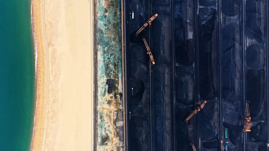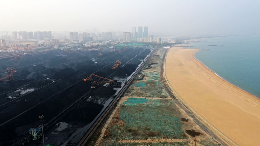 Aerial photo taken on Oct. 23, 2019 shows staff members cleaning and transporting coal to designated area at Shijiu Port Area of Rizhao Port in Rizhao City, east China's Shandong Province, Oct. 23, 2019. (Xinhua/Wang Kai)