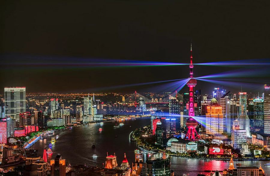 A light show is seen along the Huangpu River in Shanghai, east China, Sept. 18, 2019. (Xinhua/Ren Long)