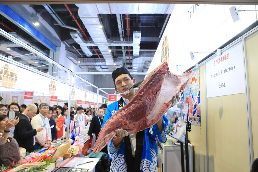 A staff member of Japan's Nagasaki Fishmarket Co., Ltd. shows a piece of bluefin tuna meat at the Food and Agricultural Products exhibition area during the second China International Import Expo (CIIE) in Shanghai, east China. (Xinhua/Sui Xiankai)