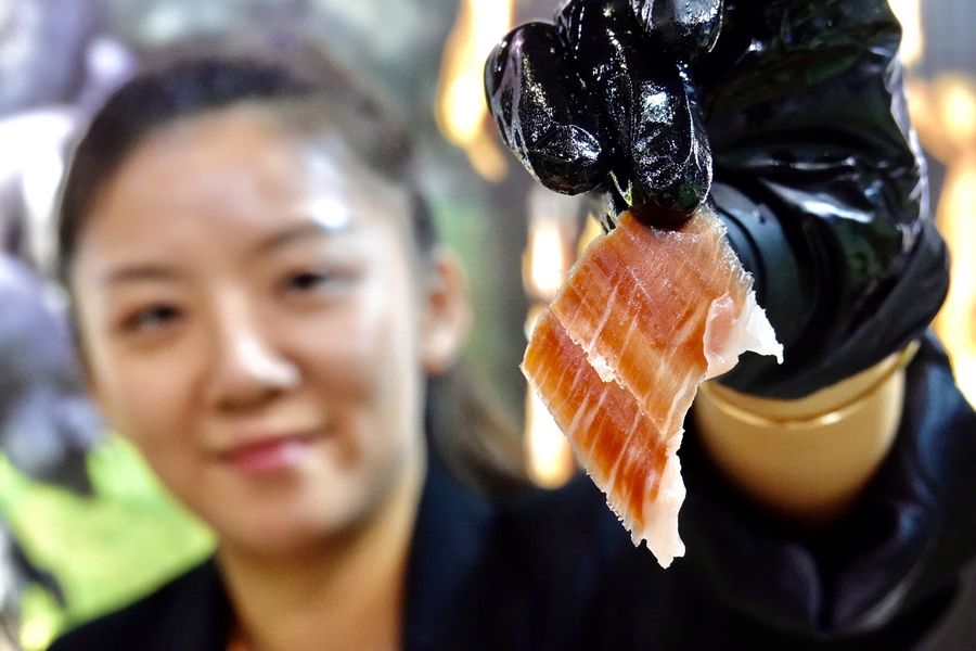 A staff member shows a slice of Spanish ham at the Food and Agricultural Products exhibition area during the second China International Import Expo (CIIE) in Shanghai, east China. (Xinhua/Cai Yang)