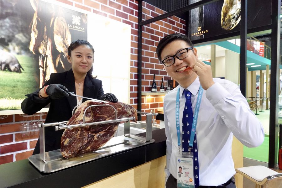 A visitor (R) tastes a slice of Spanish ham at the Food and Agricultural Products exhibition area during the second China International Import Expo (CIIE) in Shanghai, east China. (Xinhua/Cai Yang)